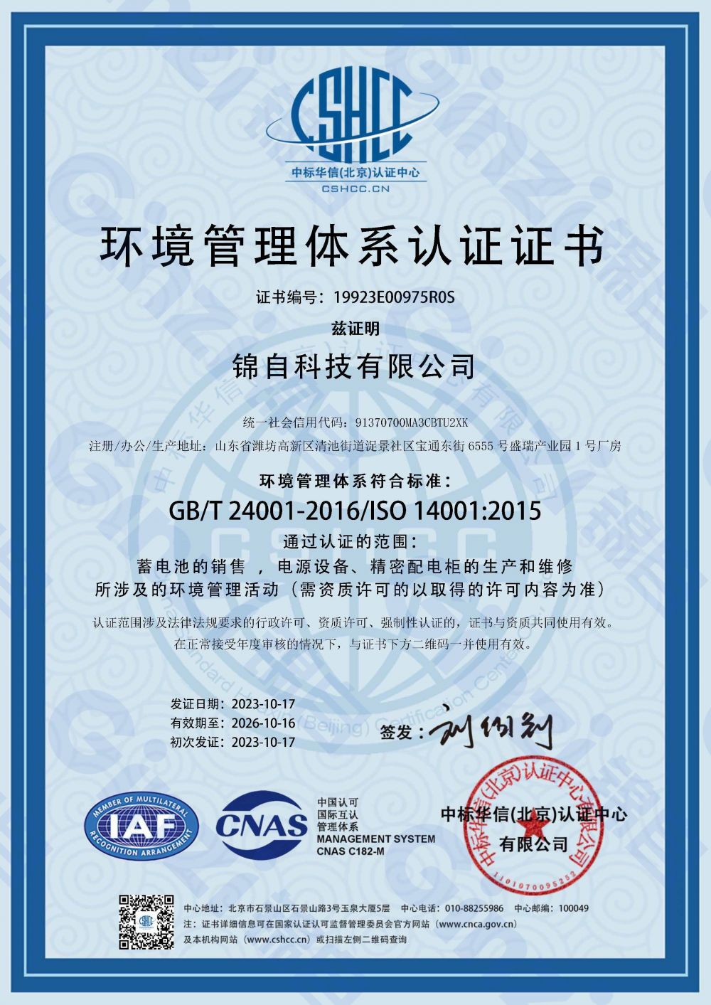环境管理体系认证证书