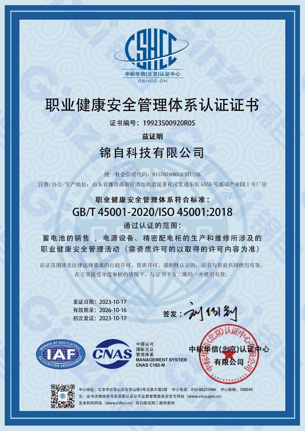 职业健康安全管理体系认证证书